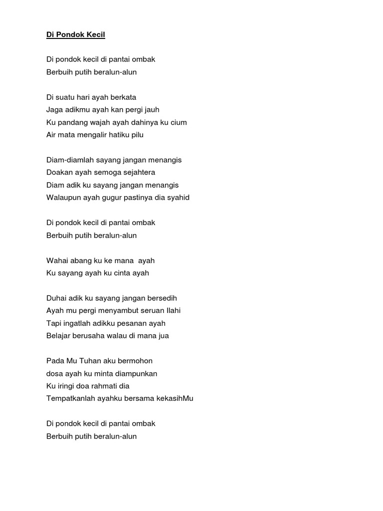 Ayah telah berpenat lelah menyara kita dari kecil sehingga besarpengorbanan seoarang ayah amatlah besarsesungguhnya Hanya Allah SWT yang Maha Mengetahu. Lirik Lagu Di Pondok Kecil Aeman Bazli UNIC. Dipondok kecil Dipantai ombak Berbuih putih Beralun-alun Di suatu hari Ayah berkata Jaga adikmu Ayahkan pergi jauh Kupandang wajah ayah Dahinya kucium Air mata mengalir hatiku pilu Diam-diamlah sayang jangan menangis Doakan Ayah semoga diterima Diam adikku sayang jangan menagis Andai Ayah gugur doakan biar syahid Selamat berjuang Ayah tercinta.
